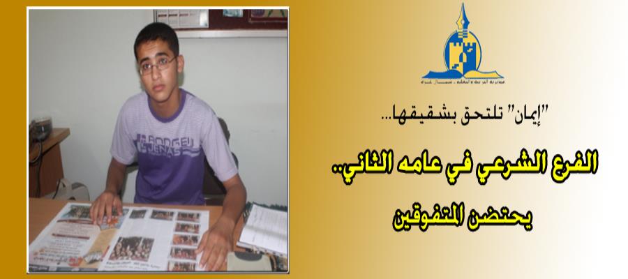 فها هي الطالبة المتفوقة إيمان ناصر مصطفى، شقيقة الطالب المتفوق "محمد" تلتحق بركب المحلّقين في فضاءات الفرع الشرعي، لتنهل من رحيق العلم الشرعي ولسان حالها مردداً "من يرد الله به خيرا يفقّهه في الدين"...