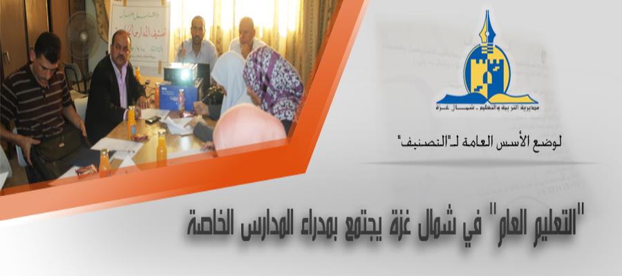 عقد قسم التعليم العام بمديرية التربية والتعليم في شمال غزة، اجتماعا ضمّ مدراء المدارس الخاصة على مستوى المديرية والبالغ عددها تسعة مدارس، وذلك لمناقشة الأسس العامة التي سيتم من خلالها تصنيف المدارس الخاصة.