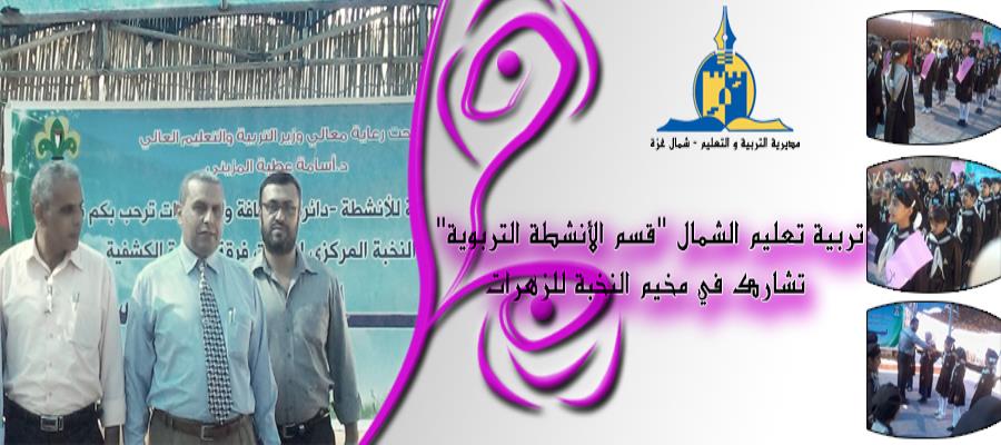 شاركت مديرية التربية و التعليم شمال غزة قسم الأنشطة التربوية في مخيم النخبة للزهرات و الذي أقيم على ارض استراحة وزارة التربية و التعليم العالي بمنطقة الوسطى على ساحل بحر غزة.
