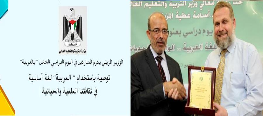 وكان وزير التربية والتعليم العالي د. أسامة المزيني قد افتتح اليوم الدراسي وقال: إن مجمع اللغة العربية الفلسطيني شرع باتخاذ خطوات عملية في سبيل حماية اللغة العربية وذلك في مؤسسات التعليم العام والعالي والمجتمع, موضحاً أن من بين هذه الخطوات إنشاء مجمع لغوي في المدارس وتنفيذ مؤتمرات ولقاءات وأنشطة ثقافية ولغوية متنوعة, وأشاد اللوزير بالمجمع في تنظيم هذا اليوم الدراسي.