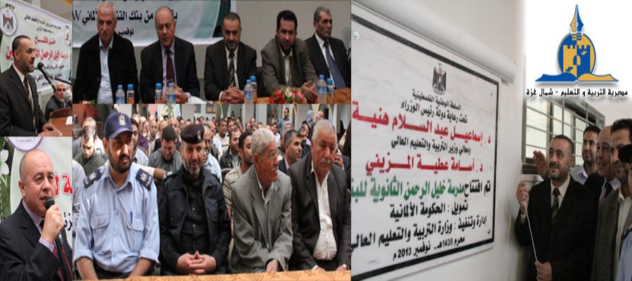 جاء ذلك خلال كلمة له في حفل افتتاح مدرسة "خليل الرحمن الثانوية للبنين" بمديرية التربية والتعليم في شمال غزة تحت رعاية وزير التربية والتعليم د.أسامة عطية المزيني، بحضور مدير التربية والتعليم أ.مدحت قاسم ونائبيه الإداري أ. منير أبو زعيتر، والفني أ.موسى شهاب، ومدير عام الشؤون المالية د.أكرم حماد، ومديرعـام الإدارات المدرسية أ. نبيل العرابيد، ومدير عام دائرة المناهج التربوية و الإشراف د. فتحي كلوب، ومدير عام العلاقات الدولية والعامة أ.عماد الحديدي، ومدير عام الأبنية والمشاريع م. جمال عبد الباري، ولفيف من رؤساء الأقسام ومديري المدارس ومديراتها ومشرفيها.
