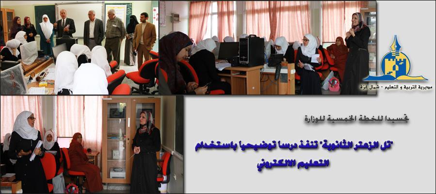 نفذت مدرسة "تل الزعتر الثانوية للبنات" بمديرية التربية والتعليم في شمال غزة، درسا توضيحيا في مبحث اللغة العربية باستخدام السبورة الذكية والتعليم الالكتروني.