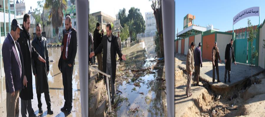 هذا وقام وفد من المديرية ضم كل من النائب الإداري أ. منير أبو زعيتر ورئيس قسم الصيانة م. رمضان الكرد، ورئيس قسم الرقابة أ. عماد أبو سمعان، ومن قسم العلاقات العامة والإعلام كل من رئيس القسم أ. إسماعيل البياري و أ. توفيق السيد سليم و أ. هاني اللداوي، بتفقد مراكز الإيواء التي فتحتها المديرية للمتضررين، كما تفقد الوفد عددا من المدارس التي لحقت بها أضرار نتيجة تدفق مياه الأمطار إليها بشكل كبير، حيث واكب الوفد عمليات إعادة ترميم ما خلفه المنخفض من أضرار تمهيدا لاستئناف الدراسة غدا.
