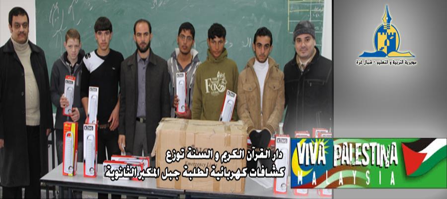 و بدوره رحب أ. السلطان بالوفد الزائر مثمنا زيارتهم لمدرسة جبل المكبر حيث قام الوفد الزائر بتوزيع الكشافات الكهربائية على 50 طالبا من الثانوية العامة و ذلك يأتي في ظل الظروف الصعبة التي يعيشها الشعب الفلسطيني المحاصر و المفروض على قطاع غزة من 8 أعوام.