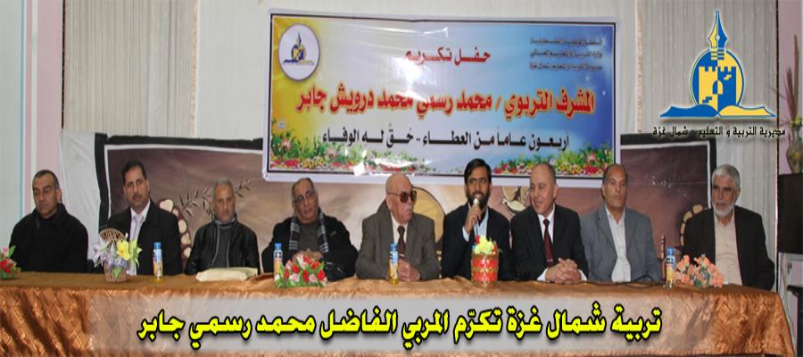 كرّمت مديرية التربية والتعليم في شمال غزة، المربي الفاضل ومشرف المرحلة،أ.محمد رسمي محمد جابر، والذي اختتم رحلة عطاء تربوي استمرت على مدار أربعين عاماً، كان خلالها نموذجا يحتذى في التفاني والإبداع.