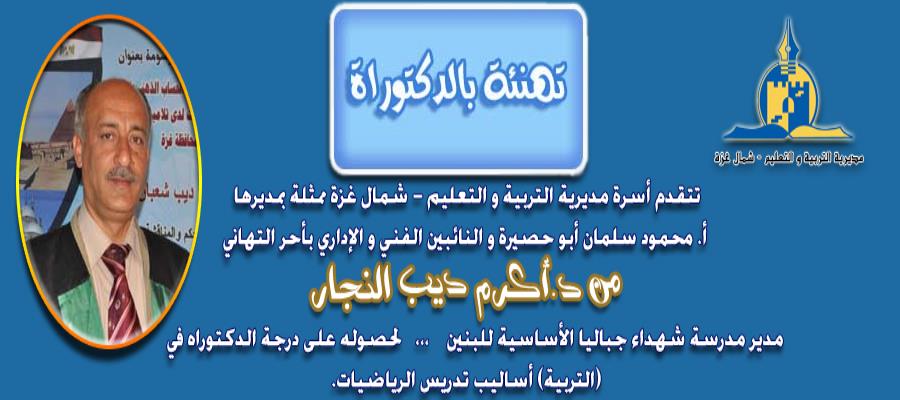 تتقدم أسرة مديرية التربية و التعليم - شمال غزة ممثلة بمديرها أ. محمود سلمان أبو حصيرة و النائبين الفني أ. موسى شهاب و الإداري أ. منير أبو زعيتر بأحر التهاني للدكتور:
