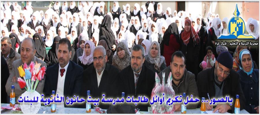 حفل تكريم أوائل طالبات مدرسة بيت حانون الثانوية للبنات, و قد حضر الاحتفال أ. مدحت قاسم نائب مدير عام التخطيط للوزارة و النائب الإداري أ. منير أبو زعيتر و رئيس بلدية بيت حانون د. محمد الكفارنة و عدد من المشرفين التربويين و رؤساء أقسام و عدد من الوجهاء و الأعيان من بلدة بيت حانون, و أولياء أمور الطالبات.