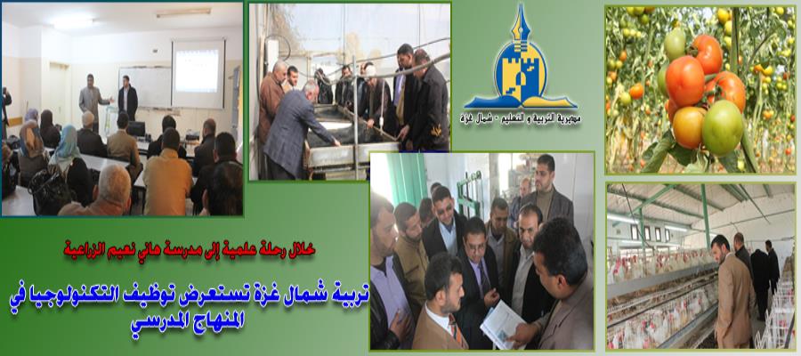 نظمت مديرية التربية والتعليم في شمال غزة، رحلة علمية شملت كافة مرافق مدرسة هاني نعيم الزراعية الثانوية للبنين ببيت حانون، وذلك بمشاركة معلمي ومعلمات مبحثي العلوم والتكنولوجيا الصف الخامس الأساسي.