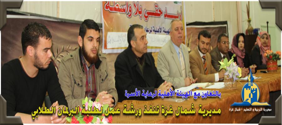 نفذت مديرية التربية والتعليم في شمال غزة، (قسم الأنشطة التربوية)، وبالتعاون مع الهيئة الأهلية لرعاية الأسرة، وبرعاية الائتلاف من أجل النزاهة والمساءلة "أمان" ورشة عمل لطالبات وطلبة البرلمان الطلابي في المرحلة العليا.