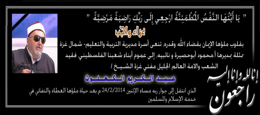 بقلوب ملؤها الإيمان بقضاء الله وقدره، تنعى أسرة مديرية التربية والتعليم- شمال غزة ممثلة بمديرها أ.محمود أبوحصيرة و نائبيه، إلى عموم أبناء شعبنا الفلسطيني، فقيد الشعب والامة العالم الجليل مفتي غزة الشيخ/