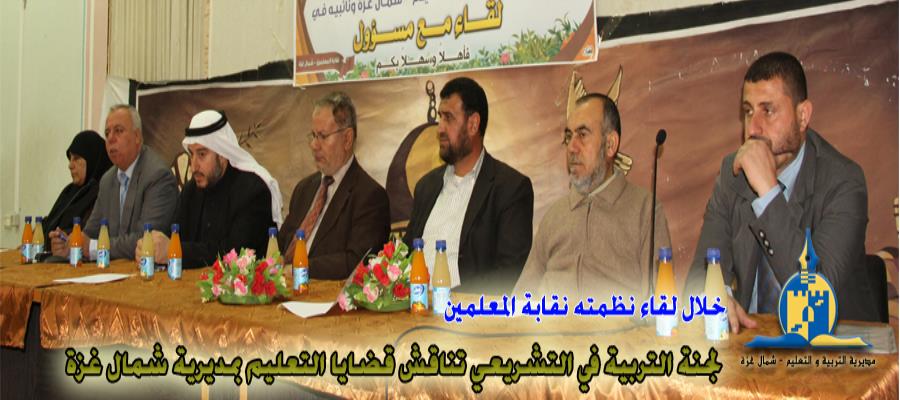جاء ذلك خلال الاجتماع الذي عُقد بمديرية تربية شمال غزة، برعاية نقابة المعلمين، وضمّ أعضاء لجنة التربية النواب د. يوسف الشرافي، و د. عاطف عدوان و د. محمد شهاب، و أ. مشير المصري، ووزيرة شؤون المرأة أ. جميلة الشنطي، ورئيس نقابة المعلمين في شمال غزة أ. محمد صلاح، ومدير التربية والتعليم أ. محمود أبو حصيرة، ونائبيه الإداري أ. منير أبو زعيتر، والفني أ. موسى شهاب، إلى جانب لفيف من مدراء المدارس ورؤساء الأقسام والمعلمين.