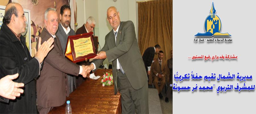 كرمت مديرية التربية والتعليم ـ شمال غزة مشرف التربية الفنية أ. محمد حسونة خلال حفل أقامته المديرية، وفاء لأهل العطاء ولجهوده في خدمة العملية التعليمية، ويأتي ذلك بمشاركة مدير التربية والتعليم شمال غزة أ. محمود أبو حصيرة، والنائب الاداري منير أبو زعيتر، والنائب الفني موسى شهاب، ورئيس قسم الاشراف أ. عبد العزيز فارس، ونائب مدير عام التخطيط بالوزارة آ. مدحت قاسم، ونائب مدير عام الاشراف التربوي آ. زياد المدهون، ولفيف من رؤساء الأقسام والمشرفين ومدراء المدارس.