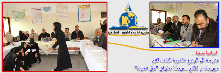 افتتحت مدرسة تل الربيع صباح اليوم مهرجان "حق العودة" بحضور وفد رفيع من سلك التعليم ممثلاً بمدير الدائرة الفنية أ. موسى شهاب، و رئيس قسم الأنشطة أ. محمد كلوب، و رئيس قسم الصحة أ. ميسرة عوكل، و رئيس قسم التعليم العام أ. تحرير المصري، و رئيس قسم الإدارات المدرسية أ. معين جاسر، و مديرة المدرسة أ. نظمية اللوقا، و رئيس بلدية بيت لاهيا أ. عز الدين الدحنون و عدد من المشرفين التربويين بالمديرية.