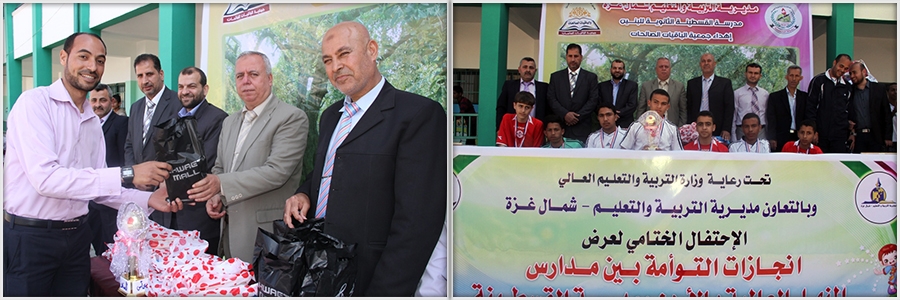 وحضر الاحتفال مدير التربية والتعليم أ. محمود أبوحصيرة، ومدير الدائرة الإدارية أ. منير أبوزعيتر، والوكيل المساعد لوزارة الشباب والرياضة د. أحمد محيسن، ومدير المدرسة أ. إسماعيل رمضان، ومنسق مشروع التوأمة أ. محمد نمر حسونة، وعدد من رؤساء الأقسام والعاملين في المديرية وشخصيات من المجتمع المحلي.