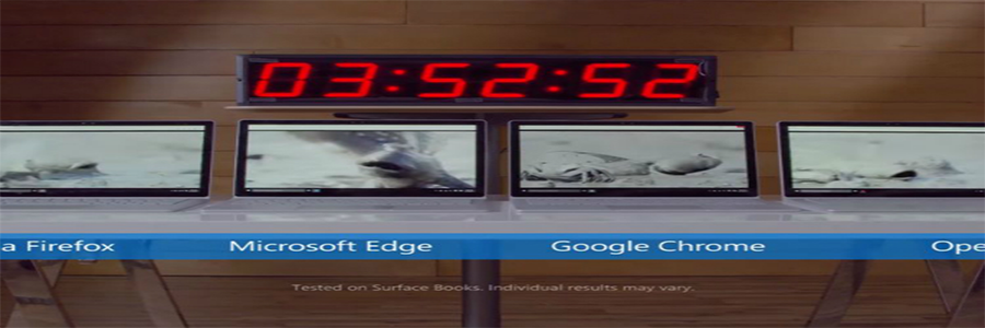 و بما أن الأمر يتعلق بفيديو ترويجي لمتصفح الشركة فإنه من البديهي أن مايكروسوفت إيدج هو المتصفح الأقل استهلاكا لطاقة البطارية بالمقارنة مع منافسه جوجل كروم، حيث نجح إيدج في تشغيل الفيديو لمدة 7 ساعات و 22 دقيقة قبل أن ينتهي شحن البطارية، فيما كروم لم يتجاوز عتبة 4 ساعات و 19 دقيقة وراء كل من موزيلا فايرفوكس بـ 5 ساعات و 9 دقائق و أوبرا بـ 6 ساعات و 18 دقيقة.