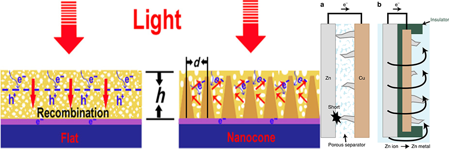 ولتعديل القصور الناجم عن استخدام فانادات بزموت (bismuth vanadate) - و هو مركب كيميائي BiVO4 على شكل بودرة صفراء لامعة مع صبغة خضراء خفيفة و هو مخضب غير عضوي معقد و ما أن يستعمل كمخضب فإنه يتميز بصفاء عالي و إخفاء الطاقة بشكل متميز -، والتي تتضمن السماح بعبور كمية كبيرة من الضوء عبر المادة، أنتج الباحثون مصفوفات مجهرية تحوي آلاف المخاريط النانوية السيليكونية، لزيادة قدرة الخلية الشمسية على حبس الضوء.