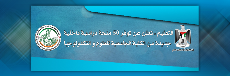 تعلن وزارة التربية والتعليم العالي عن توفير 50 منحة دراسية داخلية جديدة لخريجي الثانوية العامة2016 م وذلك بالتعاون مع الكلية الجامعية للعلوم و التكنولوجيا بخانيونس في التخصصات التالية: