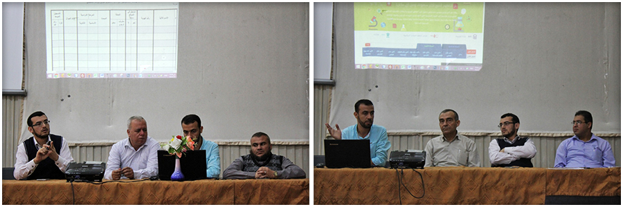 وافتتح اللقاء مدير التربية والتعليم أ. محمود أبوحصيرة، ومدير الدائرة الفنية أ. موسى شهاب، ومشرف التكنولوجيا أ. أحمد أبوعلبة، ومن وزارة التربية والتعليم، رئيس قسم التعليم الالكتروني أ. أكرم فروانة، ورئيس شعبة التعليم الالكتروني أ. ماهر الزعلان، و مسئول برمجة الكتب التفاعلية في التعليم الإلكتروني م. شادي أبوالرووس.