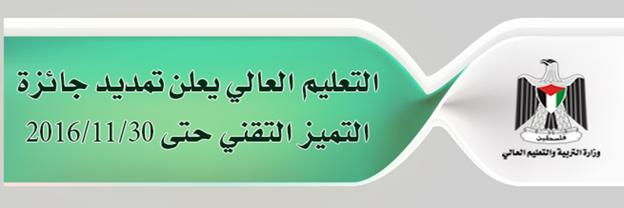 قررت الإدارة العامة للكليات و التعليم المهني و التقني بوزارة التربية و التعليم العالي بالتنسيق مع اللجنة المشرفة علي الجائزة تمديد موعد استلام المشاريع المشاركة في جائزة وزارة التربية و التعليم العالي للتميز التقني 2016مإلي يوم الأربعاء الموافق 30/11/2016م.