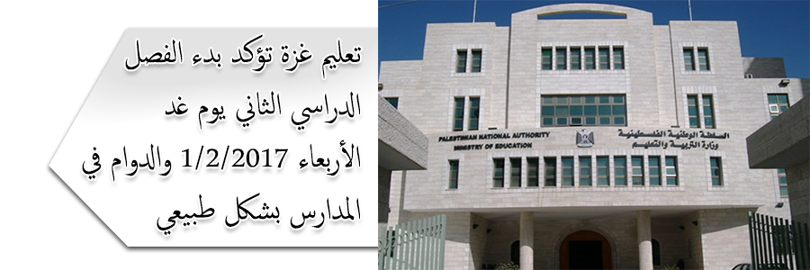 وزارة التعليم بغزة تؤكد بدء الفصل الدراسي الثاني يوم غد الاربعاء1/2/2017، في المدارس بقطاع غزة.