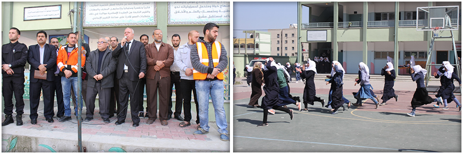 نفذت مدرسة حمد بن خليفة الثانوية للبنات بمديرية التربية والتعليم في شمال غزة، مناورة للإخلاء الآمن، وذلك ضمن فعاليات مشروع جهوزية المدارس للطوارئ والذي يُنفّذ بالتنسيق والتعاون بين وزارة التربية والتعليم العالي وجهاز الدفاع المدني بوزارة الداخلية، و"اليونيسيف".