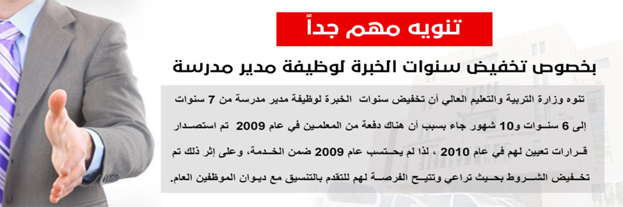تنوه وزارة التربية والتعليم العالي أن تخفيض سنوات الخبرة لوظيفة مدير مدرسة من 7 سنوات إلى 6 سنوات و10 شهور جاء بسبب أن هناك دفعة من المعلمين في عام 2009 تم استصدار قرارات تعيين لهم في عام 2010، لذا لم يحتسب عام 2009 ضمن الخدمة، وعلى إثر ذلك تم تخفيض الشروط بحيث تراعي وتتيح الفرصة لهم للتقدم بالتنسيق مع ديوان الموظفين العام.