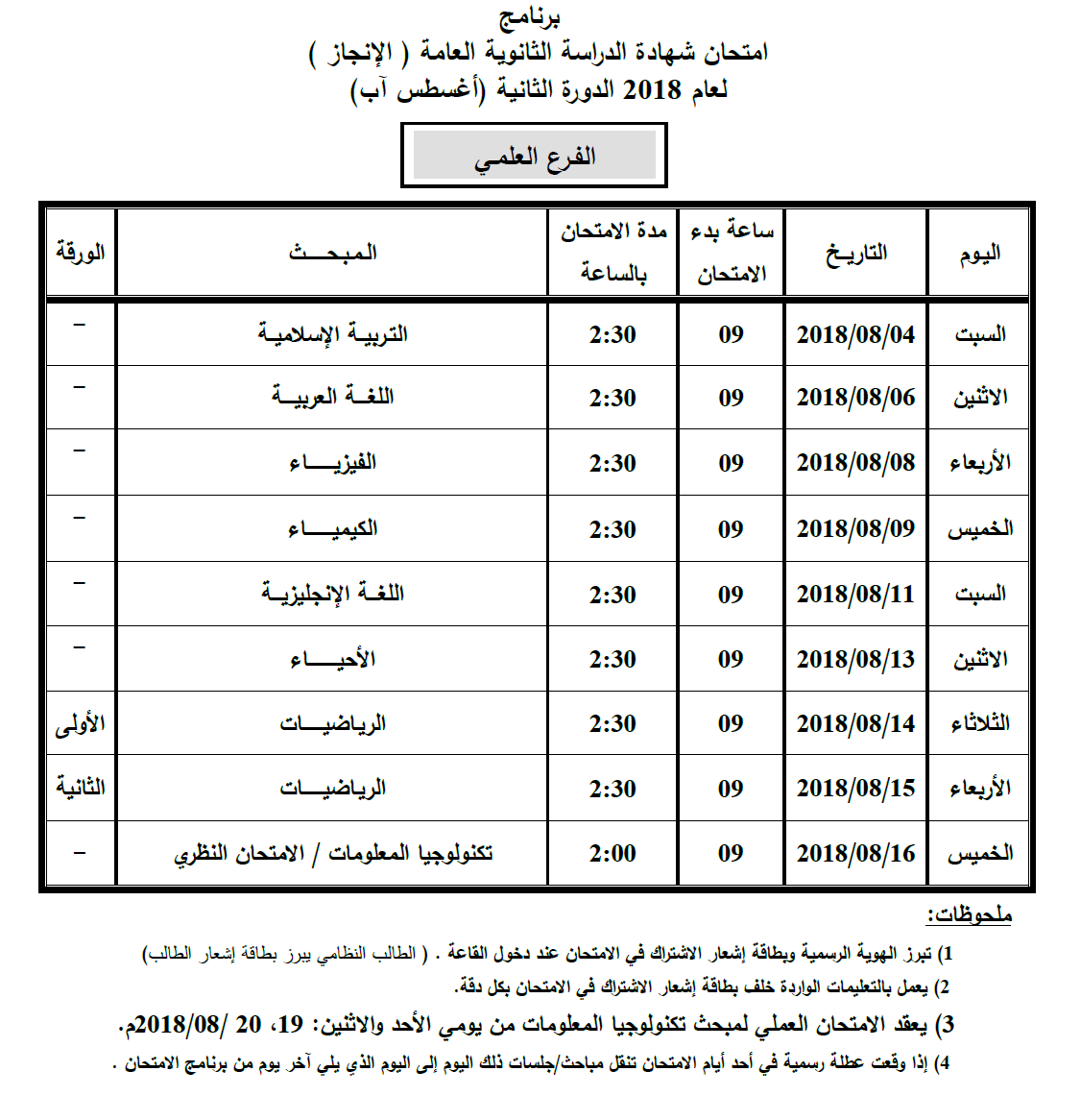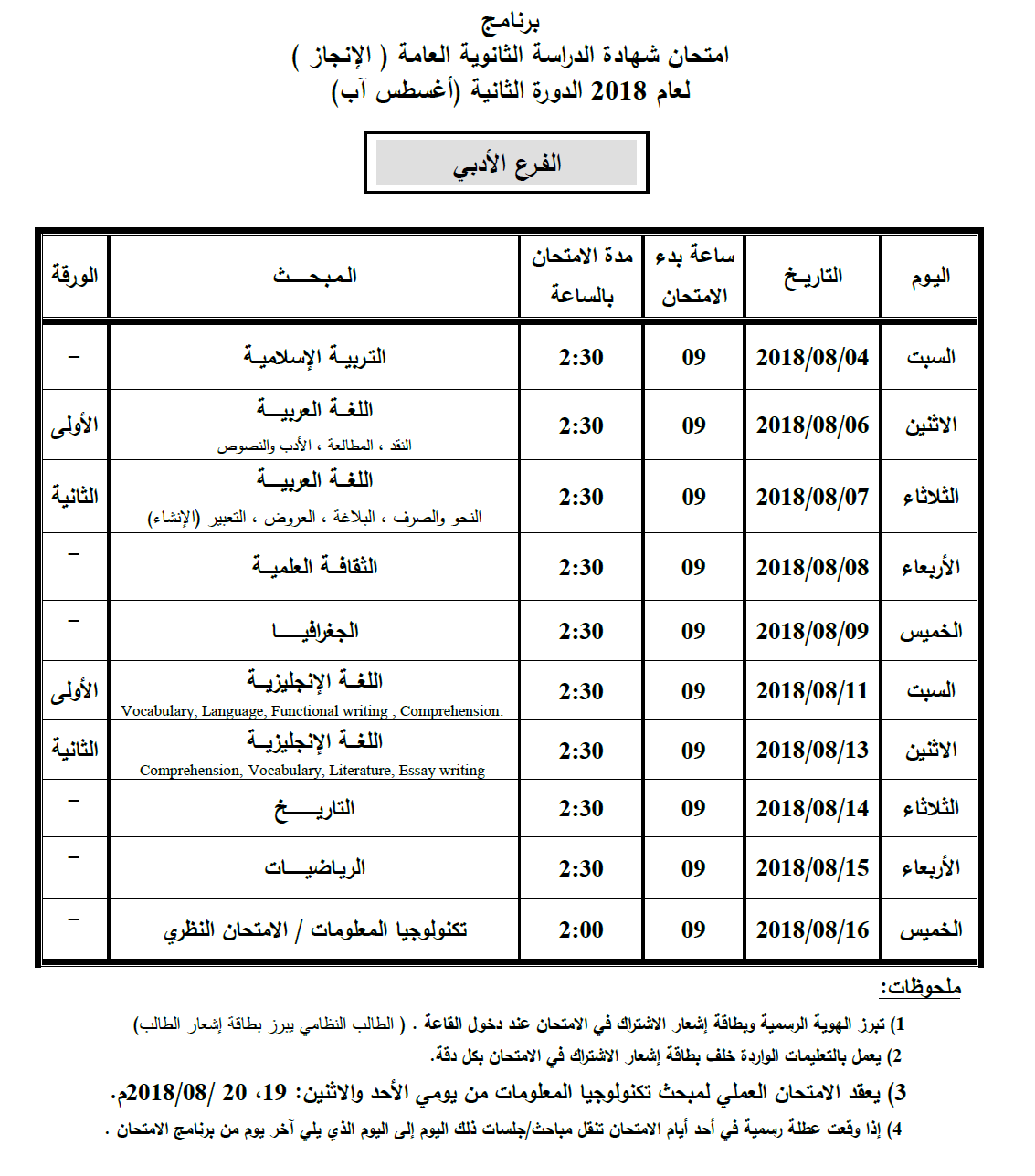 الجدول الشامل لامتحانات الإكمال و التحسين
