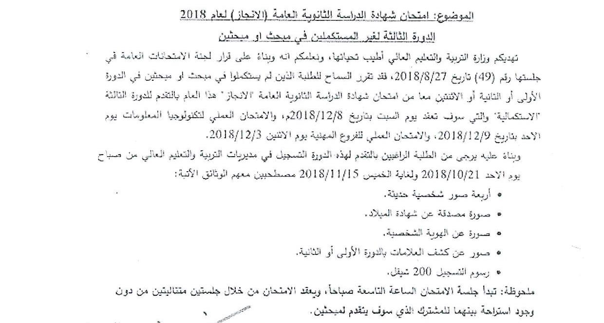 ملحوظة: التسجيل فقط للطلبة غير المستكملين في مبحث أو مبحثين من الدورة الأولى أو الثانية و لا يشمل من يرغب بتحسين المعدل.