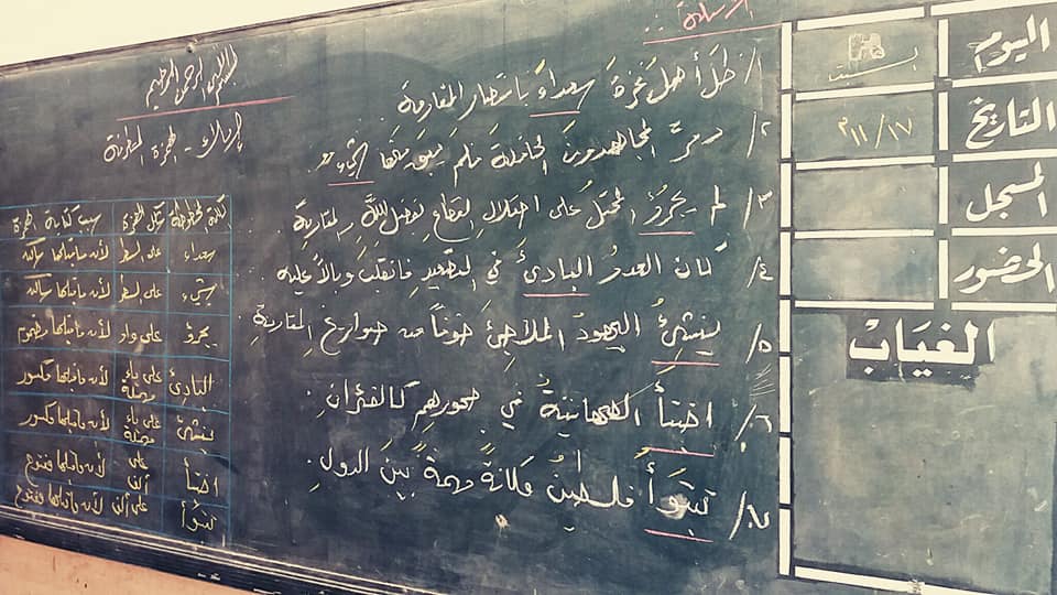 وكان المعلم عكاشة قد نظم الدرس بشكل تفاعلي مصحوباً بأمثلة تعبر عن انتصار المقاومة ومن الأمثلة التي كتبها : ظل أهل غزة سعداء بانتصار المقاومة- دمر المجاهدون الحافلة فلم يبق منها شيء– لم يجرؤ المحتل على احتلال القطاع بفضل الله والمقاومة- كان العدو البادئ في التصعيد…)