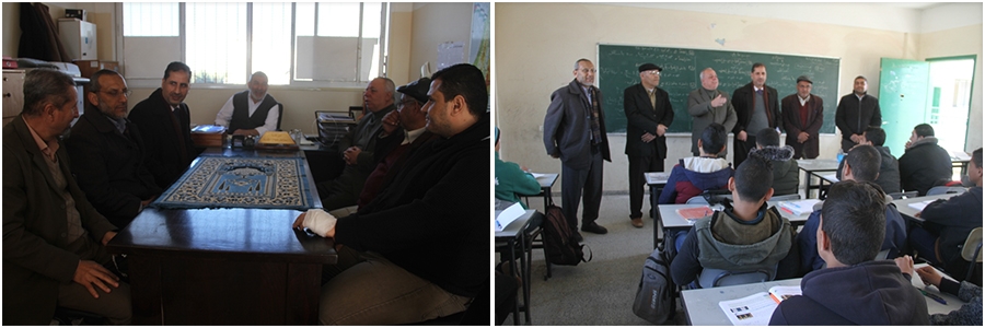 وكان في استقبال الوفد نائب المدير أ. محمد ابو الحسنى وطاقم الهيئة التدريسية حيث قام أ. ابو حصيرة بجولة على الفصول، تحدث فيها الى الطلاب واستمع اليهم وبث فيهم روح الجد والمثابرة والاجتهاد والطمأنينة.