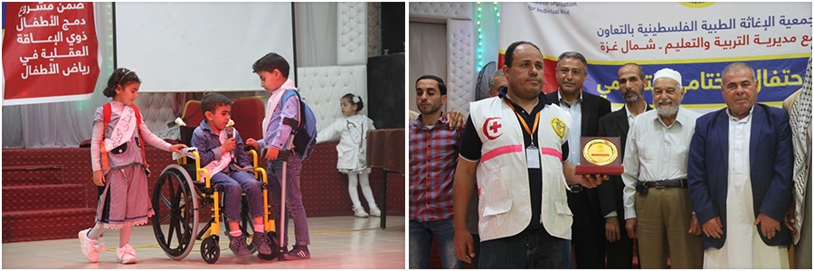 في صالة الطيب بمخيم جباليا، كرمت مديرية التربية والتعليم قسم التعليم العام الأطفال ذوي الإعاقة والذي تم دمجهم في رياض الأطفال بمحافظة شمال غزة، بالتعاون مع جمعية الاغاثة الطبية وبرعاية من دولة السويد.
