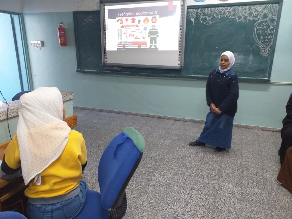 فيما جاء درس اللغة الانجليزية بعنوان "A young nurse is saved from 10th floor fire" والذي نفذته الطالبة سارة أحمد للصف "العاشر8" باستخدام استراتيجيات، "ساعي البريد" و "مسابقة ترتيب أحداث القصة"، وتم عرض الصور التوضيحية عن طريق شرائح البوربوينت، وأشرفت على الدرس المعلمة أ. ربا أبو جاسر.
