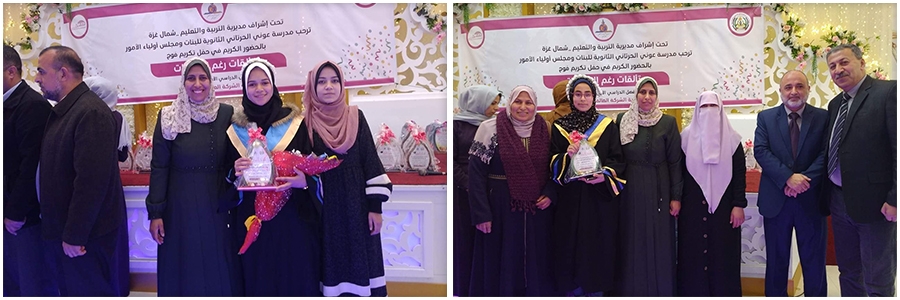 كرّمت مدرسة عوني الحرثاني الثانوية للبنات بمديرية التربية والتعليم في شمال غزة، بالتعاون مع مؤسسات المجتمع المحلي، فوج "متألقات رغم التحديات" من طالباتها المتفوقات خلال الفصل الدراسي السابق.