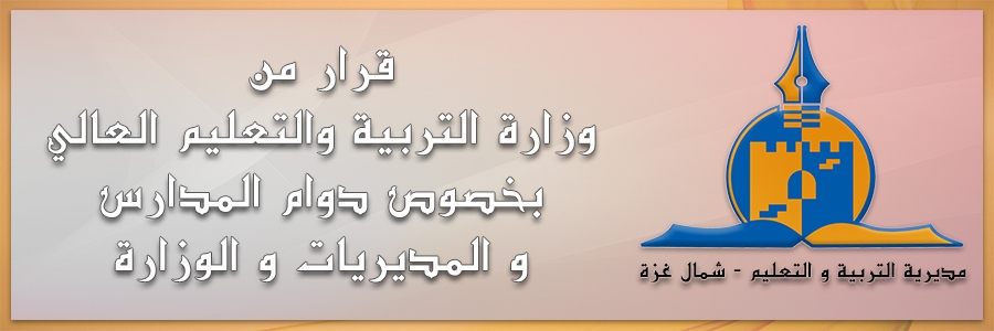 * قررت وزارة التربية والتعليم استمرار تعليق الدراسة في المدارس ورياض الأطفال في غزة حتى نهاية الأسبوع الحالي واستئناف الدراسة كالمعتاد يوم السبت القادم 14 مارس ما لم يطرأ أي مستجدات.