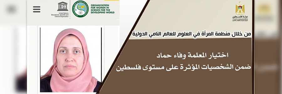 اختارت منظمة المرأة في العلوم للعالم النامي (OWSD) المعلمة الدكتورة وفاء حماد من مدرسة فيصل بن فهد الثانوية للبنات بشمال غزة ضمن الشخصيات المؤثرة على مستوى فلسطين وذلك لأعمالها ومبادراتها وأبحاثها التربوية واللغوية، حيث الآن اصبحت ممثلة عن فلسطين في المنظمة من ضمن 60 شخصية على مستوى فلسطين.