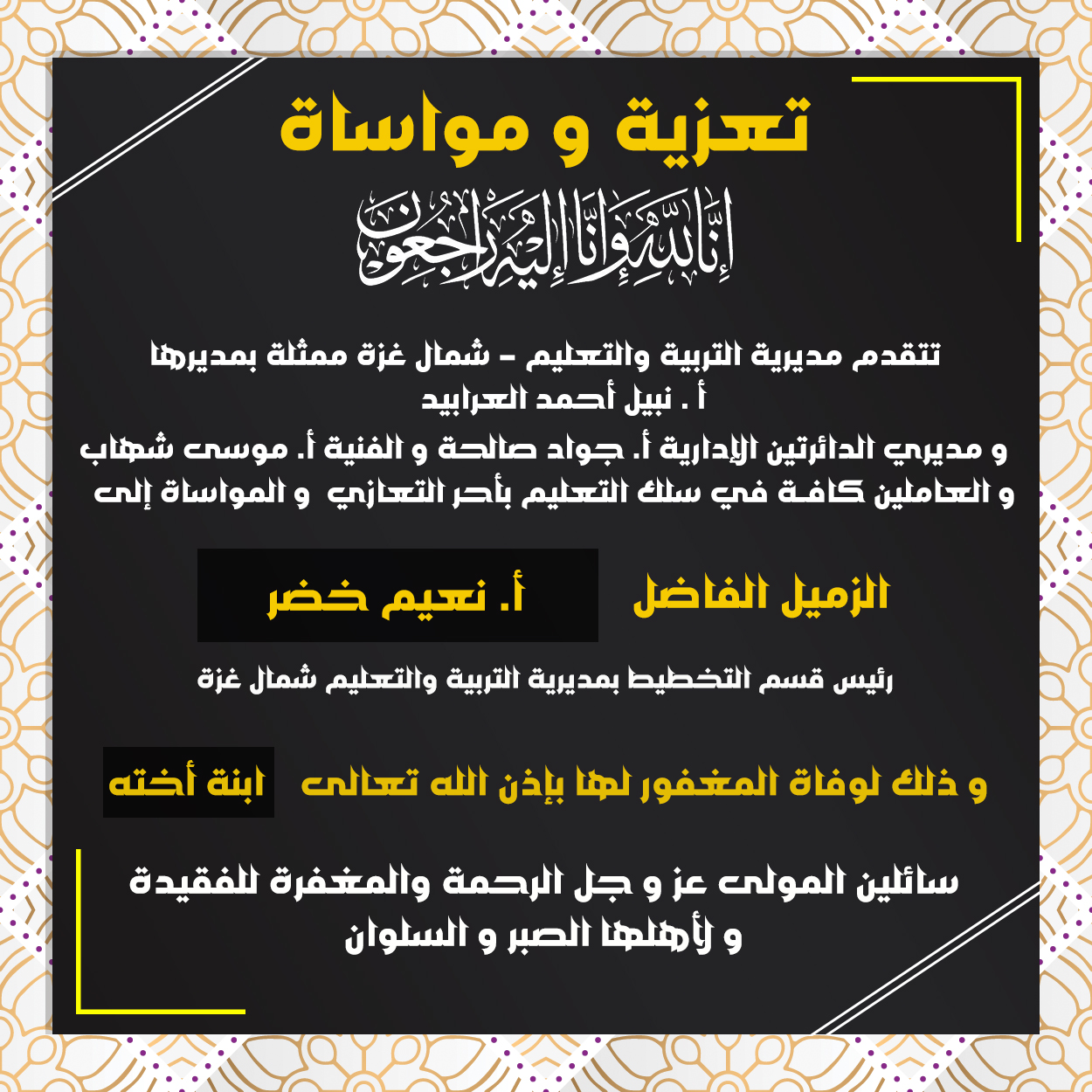 تعزية و مواساة للزميل الفاضل الأستاذ/ "نعيم خضر"