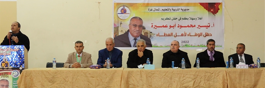 وسط حضور لافت من كوادر العملية التعليمية، من مدراء مدارس، ومعلمين، ومدراء دوائر، ورؤساء أقسام، وعاملين، وشخصيات من المجتمع المحلي، كرّمت مديرية التربية والتعليم - شمال غزة، المربي الفاضل تيسير أبو عميرة (أبو محمود)، رئيس شعبة الأنشطة الطلابية؛ لبلوغه سن العطاء، بعد مسيرة تربوية وتعليمية حافلة.