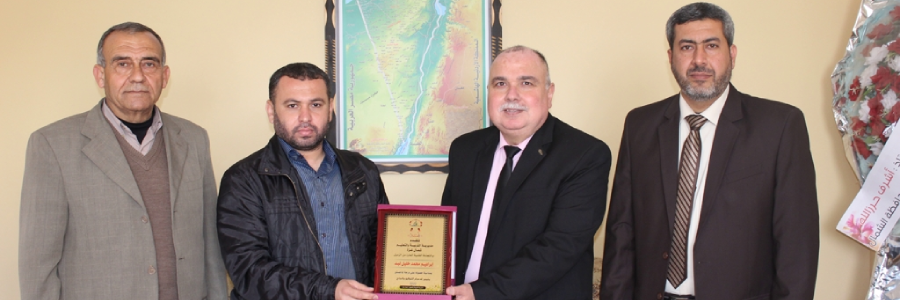 بالصور: مدير التربية و التعليم أ. أشرف حرز الله يقدم درع التهنئة إلى أ. إبراهيم لبد، و بحضور مدير الدائرة الإدارية أ. جواد صالحة و مدير الدائرة الفنية أ. موسى شهاب، لحصوله على درجة الماجستير