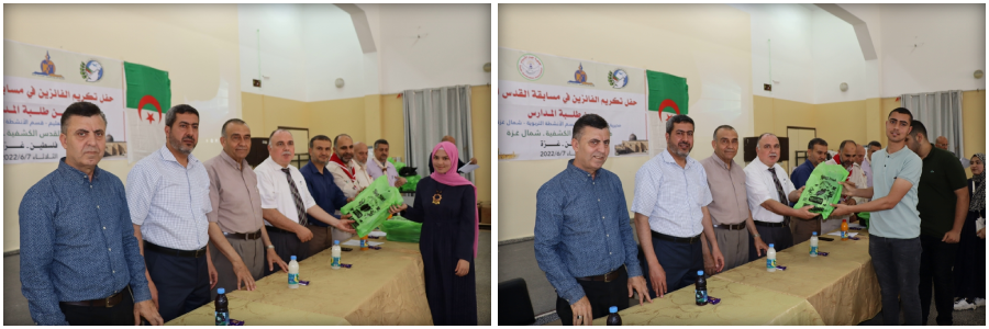 كرّمت مديرية التربية والتعليم في شمال غزة، وبالتعاون مع مجموعة القدس الكشفية، وجمعية الأيادي البيضاء الجزائرية، الطلبة الفائزين في مسابقة "القدس الكشفية" التي أشرف على تنظيمها قسم الأنشطة الطلابية بالمديرية مؤخراً، بمشاركة العشرات من الطلبة.