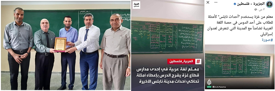 يشار هنا وسائل الإعلام العربية تناولت هذا الموضوع، حيث نشرت قناة الجزيرة القطرية "معلم من غزة يستخدم "أحداث نابلس" كأمثلة للطلاب في دروس اللغة العربية"، بينما قناة العربية فنشرت، "معلم لغة عربية يشرح الدرس بإعطاء أمثلة تحاكي أحداث نابلس الأخيرة".