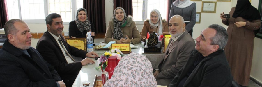 وفد من مديرية التربية والتعليم في شمال غزة برئاسة مدير التعليم أ. جواد صالحة، يقدم واجب التهنئة لمديرة مدرسة معاوية بن أبي سفيان الأساسية المشتركة أ. لينا الجاروشة، بمناسبة عودتها إلى أرض الوطن.