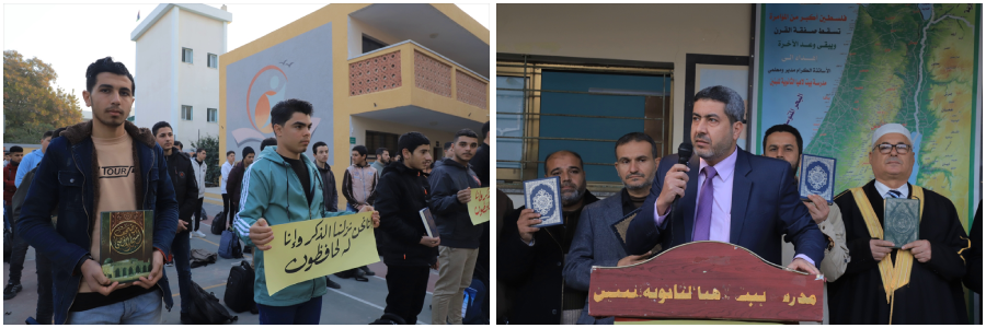 وفي كلمة له، رحّب مدير المدرسة أ. غازي المدهون بالحضور كافة، مؤكداً أن جريمة إحراق نسخة من المصحف الشريف في السويد مؤخراً، تعكس مدى الحقد الدفين الذي يسكن قلوب أعداء الله على الدين الإسلامي الحنيف.