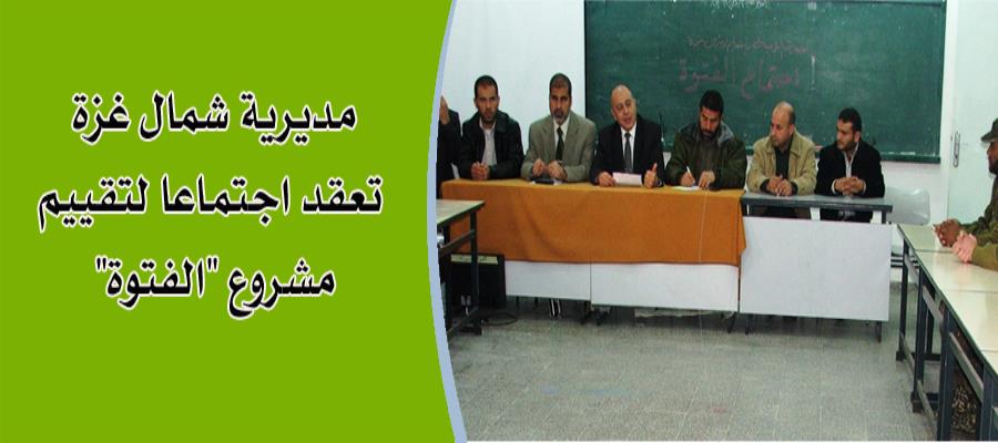 عقدت مديرية التربية والتعليم في شمال غزة اليوم، اجتماعا لتقييم مشروع "الفتوة" الذي ينفذ في مدارس المرحلة الثانوية من البنين، وذلك بهدف تطوير المشروع والوقوف عند بعض الجوانب التي من شأنها العمل على تعزيزه والنهوض به.