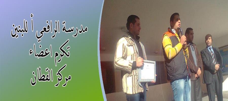 اقامت مدرسة الرافعي أ للبنين مهرجان تكريم لفريق المكتبة المتنقلة ( مشروع ابداع) بمركز القطان السادة : سائد البس و محمد وشاح وأمل الراس على ما قدموه من برامج ترفيهية للطلبة على مدار الفصل الدراسي الأول للعام الدراسي 2012 2013. وفي نهاية الاحتفال قام مدير المدرسة أ أشرف الكرد وأمين المكتبة أ اسماعيل الجذبة بتقديم شهادة شكر وتقدير لأعضاء فريق المكتبة المتنقلة .