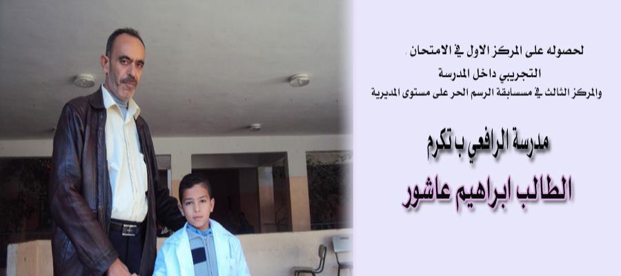 في إطار الجهود التي تبذلها المدرسه في شتى المجالات التربويه من أجل الرقي بأبنائها ، كرم السيد مدير المدرسة الأستاذ عبد الله رضوان الطالب إبراهيم إيهاب عاشور من الصف الرابع الاساسي لتفوقه الدراسي وتميزه في الإختبارات التجريبيه التي عقدتها المدرسه والتي تأتي ضمن الخطة الشامله للمدرسه حيث تقدم المعلمان الأستاذ حسن جنيد معلم اللغه العربيه والاستاذ كمال المطوق معلم الرياضيات بتكريمه ، االجدير بالذكر أن الطالب قد حصل على المركز الثالث في مسابق الرسم الحر التي انعقدت بالمديريه .حيث مثل المدرسه وأحرز المركز الثالث على مستوى الشمال .