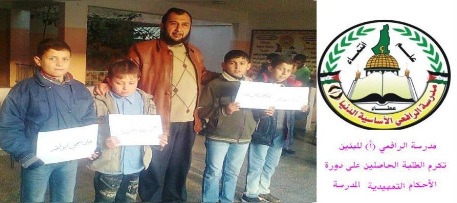 ضمن جهود المدرسة للنهوض بأبنائها وتحفيزهم كرم اليوم مدير مدرسة الرافعي الأساسية (أ) للبنين الأستاذ/ أشرف أحمد الكرد و استاذ التربية الأسلاميةالأستاذ/ أحمد ديب ضميدة الطلبة الحاصلين على دورة الأحكام التمهيدية . وهم محمد يوسف النجارو مصطفى نضال الندر و محمد خضر ضميدة وعلي منجي ابولغد والتي اقيمت في مدرسة النقب (أ) على يد الشيخ الأستاذ / حسام أبو شباك .