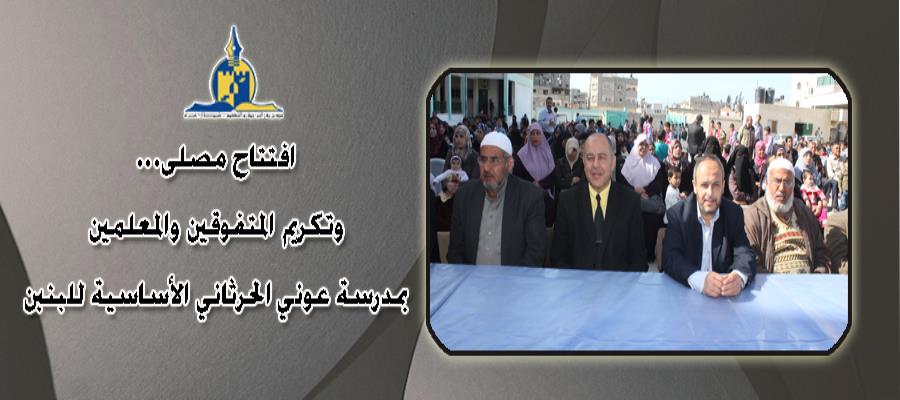 افتتحت مدرسة عوني الحرتاني الأساسية للبنين بمديرية التربية والتعليم في شمال غزة اليوم، مصلى، وكرّمت الطلبة المتفوقين، وطاقم الهيئة التدريسية والإدارية بالمدرسة.
