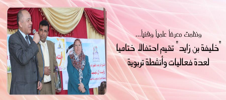 أقامت مدرسة خليفة بن زايد الأساسية للبنات بمديرية التربية والتعليم في شمال غزة، عدة فعاليات تربوية وذلك بإقامة احتفال ومعرض علمي وفني تضمن الكثير من الأشغال المميزة التي تترجم المنهاج المدرسي.