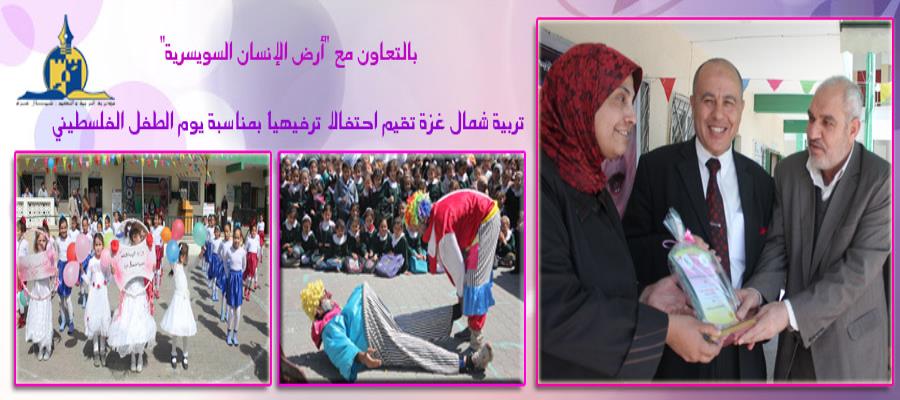 أقامت مديرية التربية والتعليم في شمال غزة تحت رعاية وزير التربية والتعليم العالي، وبالتعاون مع مؤسسة أرض الإنسان السويسرية، احتفالا ترفيهيا لرياض الأطفال بمناسبة يوم الطفل الفلسطيني الذي يصادف الخامس من أبريل من كل عام.