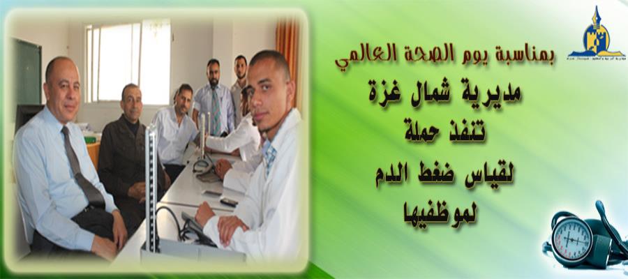 نفذت مديرية التربية والتعليم في شمال غزة، حملة لقياس ضغط الدم لجميع موظفي المديرية، وذلك بالتعاون مع وزارة الصحة بمناسبة يوم الصحة العالمي والذي اتخذ شعار (ارتفاع ضغط الدم) شعارا له للعام الجاري 2013م.